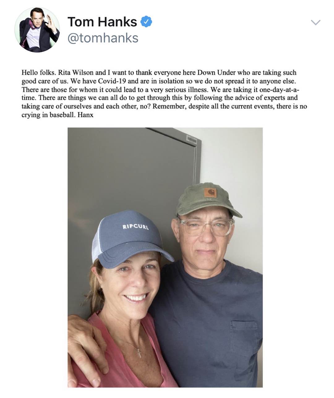 3月12日,好莱坞演员汤姆·汉克斯公开声明,表示自己与妻子丽塔·威尔逊在澳大利亚拍摄新片时感染新冠肺炎。13日,汤姆·汉克斯再公开发声报平安,称他与妻子正在隔
