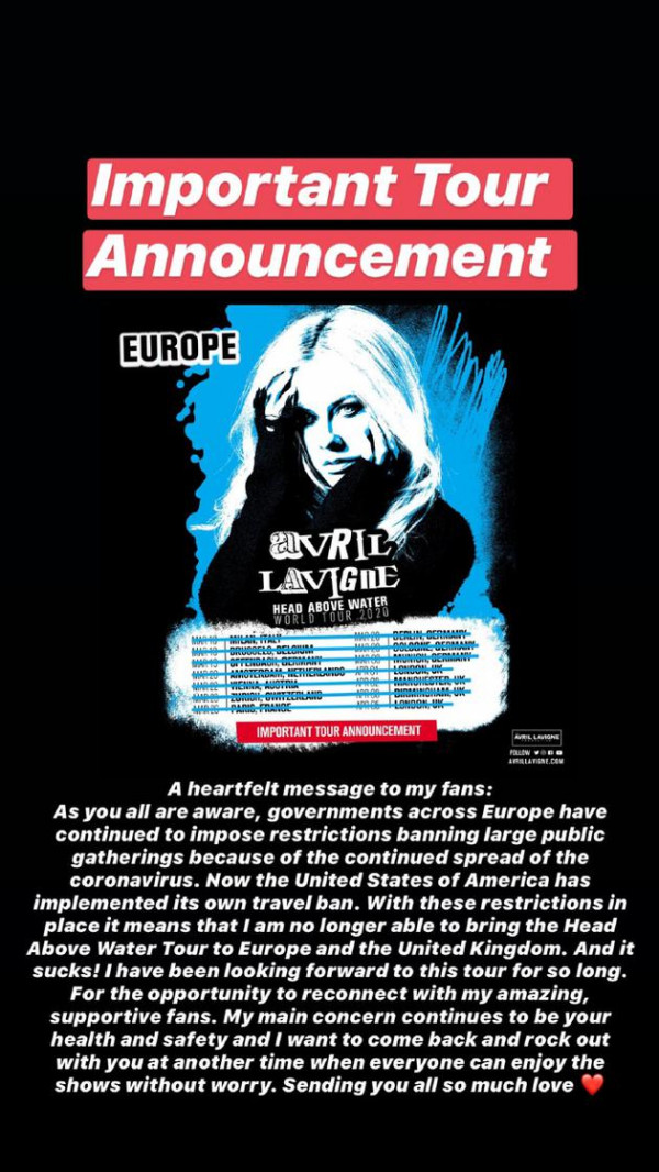 受新冠疫情影响,艾薇儿在社交平台发文确认将取消Head Above Water欧洲巡演。她在文中表示欧洲各国政府已经采取措施限制公共活动,而美国也宣布对欧洲实施旅行禁令,她不得不取消巡演活动。艾薇儿称希望等疫情结束之后再回来。