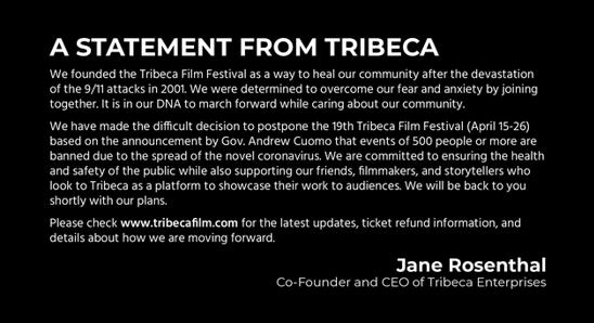 当地时间3月12日,原定将于4月15日至4月26日在纽约举行的第19届翠贝卡电影节宣布延期,具体时间待定。纽约州州长安德鲁·科莫已宣布该州将禁止500人以上的活动。