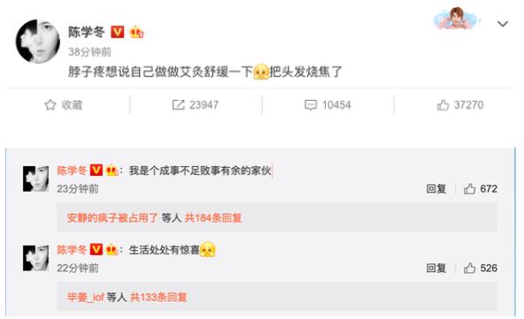 陈学冬发文分享宅家日常,他写道因为脖子疼想自己做做艾灸舒缓一下,结果却把头发烧焦了。随后,他还在评论中调侃自己是:“成事不足败事有余的家伙 ”,还表示生活处处有惊喜。此前,陈学