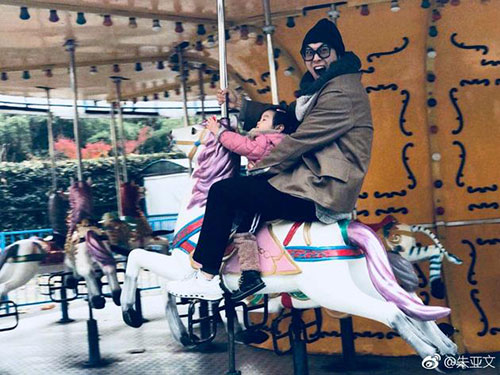 12月7日,朱亚文在微博上晒出一张照片,并配文:“旋转木马坐久了真的会晕”。照片中,朱亚文怀抱女儿玩旋转木马,张大嘴巴童心未泯。