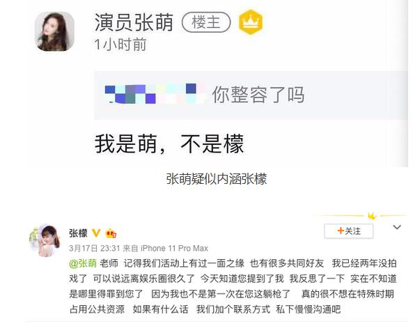 17日晚,张萌在回答网友问她整容没时表示“我是萌,不是檬”,疑似公开内涵张檬整容,随后张檬发文回应张萌,表示自己已经两年没拍戏了,远离娱乐圈很久了,不知道是哪里得罪到她,&ld