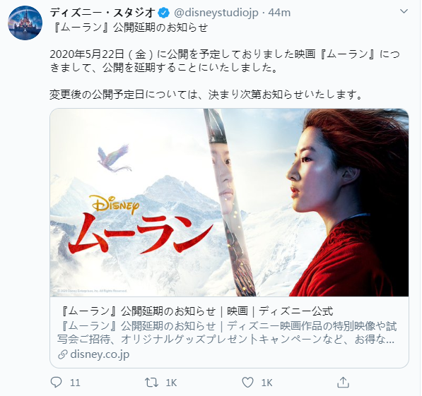该片10天前宣布全球大规模撤档,而最新,迪士尼日本官推表示该片推迟上映,新档期还未定。