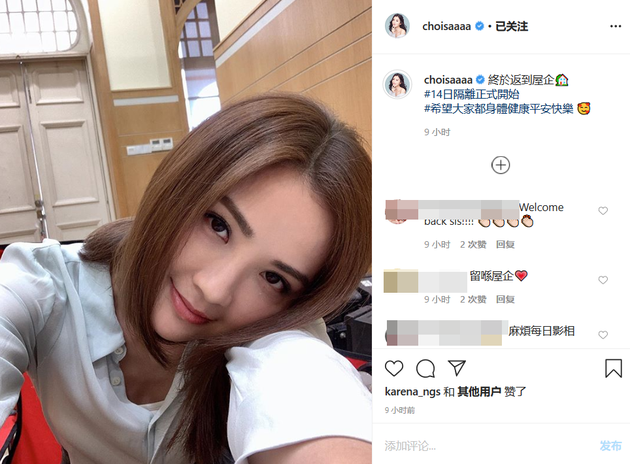 3月25日,阿Sa返回香港家中后,在个人社交网站晒出自拍报平安,“终于回到家,14日隔离正式开始,希望大家都身体健康平安快乐。”