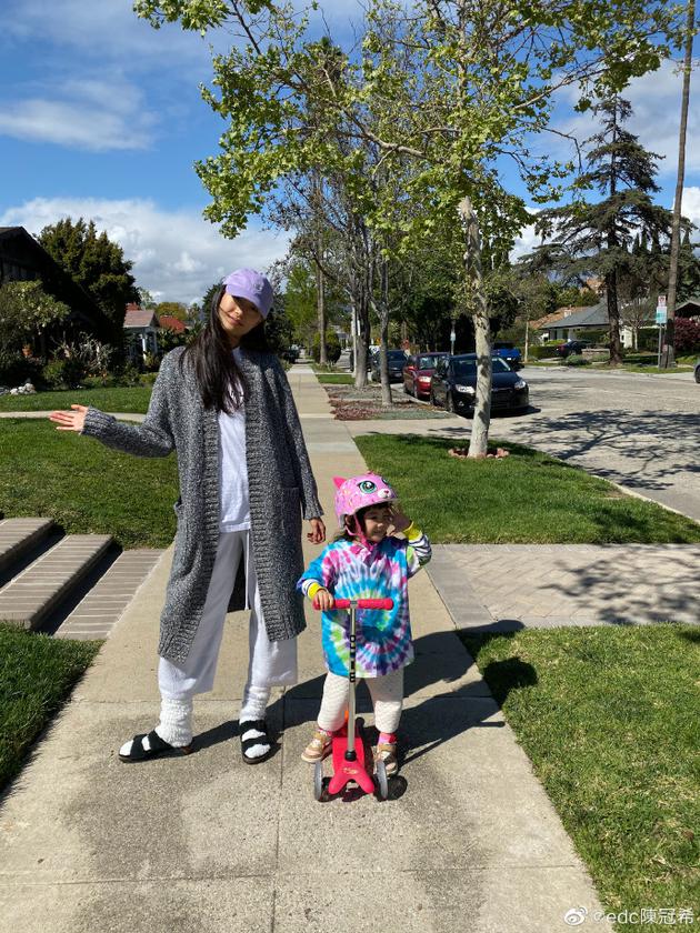 3月26日,陈冠希在微博超宠溺地晒出爱妻与女儿的可爱合影,并配文:“早”。照片中秦舒培身穿毛衣长外套配拖鞋,头戴藕荷色棒球帽,装扮简单居家。一旁的小Alaia戴着粉色小猫头盔,穿彩色上衣,开心地玩着滑板车,画面温馨有爱。