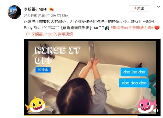3月26日,王力宏妻子李靓蕾在微博晒出女儿洗手的视频,并发文:“正确洗手需要极大的耐心,为了引发孩子们对洗手的热情,今天跟女儿一起用Baby Shark的曲写了《鲨鱼宝宝洗手歌》。&rdq