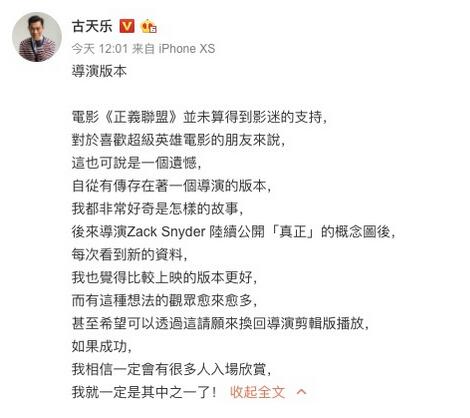 3月26日,超级英雄影迷古天乐表示希望看到《正义联盟》导演剪辑版。称对《正义联盟》上映版反响不佳而感到遗憾,看到导演剪辑版的新资料后,觉得比上映版好,如果能发行,很多影迷包括他一定会观看。