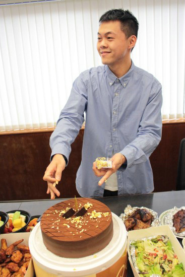 歌手曾昱嘉28日生日,唱片公司同事昨特别为他庆生,并献上巧克力金箔蛋糕,祝他新歌《看破》步步高升、新专快快诞生,来年有望得金曲奖!寿星曾昱嘉的福利是在蛋糕上洒金箔,他边洒边赞叹说:“好尊贵啊!”每个动作都小心翼翼,不料同事说冷笑话,让他忍不住喷笑,瞬间引起“金箔风暴”,大家一阵惊叹,直说金箔爆成小宇宙好美,曾昱嘉则无辜说:“都是你们啦,害我一笑就喷了!”