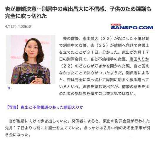 据日媒,渡边杏已经决意与东出昌大离婚。知情人士透露,杏之前因为孩子还有些犹豫,但对东出已经没有信任感,在东出昌大上月记者会之前,就已找好了律师着手准备离婚事宜。据悉,今年1月,东出昌大与渡边杏被曝已经