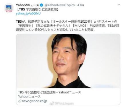 据日媒,受疫情影响,TBS预定播出的《全明星感谢祭2020春》和4月开播的《半泽直树2》、《我的家政夫渚先生》、《MIU404》将延期播出。