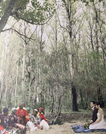 照片中,吴彦祖和老婆在原始森林里举行婚礼,他们跪坐在一块布上,面前是当地原住民,场景十分浪漫。