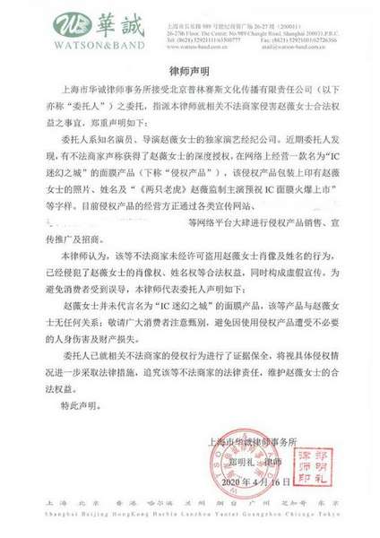声明还强调:“赵薇并未代言该面膜产品,该产品与赵薇无任何关系;敬请广大消费者注意甄别,避免因使用侵权产品遭受不必要的人身伤害及财产损失。委托人已就相关不法商家的侵权行为进行了证据保全,将视具体侵权情况进一步采取法律措施,追究该等不法商家的法律责任,维护赵薇的合法权益。”