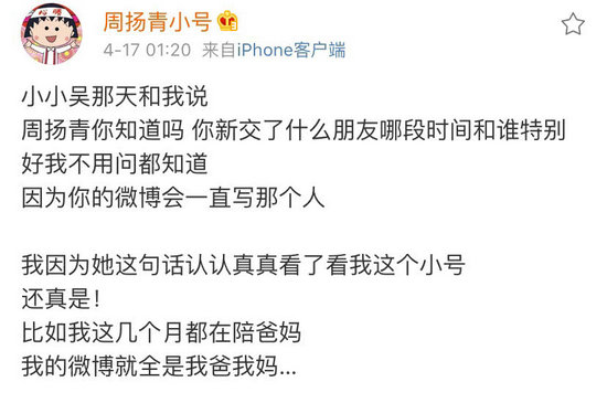 4月17号凌晨,周扬青在小号在发声,曝光了自己近几个月的现状,除了日常工作,都在陪伴自己的父母,社交平台晒的也都是爸爸妈妈。