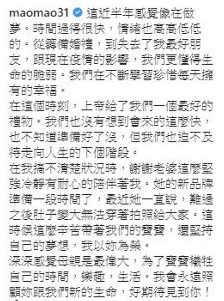 毛加恩宣布将做爸爸 感慨痛失好友高以翔