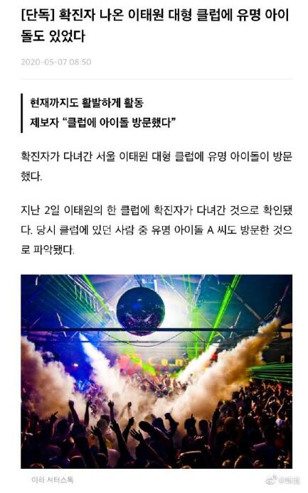 据韩媒,5月2日,首尔某俱乐部发现一例确诊病例,据称当时在夜店的人中有著名的偶像A某。