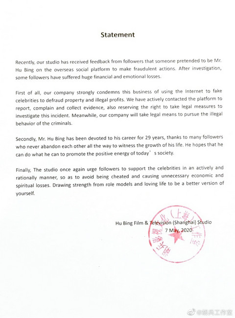 声明 英文5月7日,胡兵[微博]工作室发声明表示近期有不法用户在海外社交平台假冒胡兵小号名义私信粉丝进行诈骗,此举对胡兵先生的名誉造成了严重影响。将采取法律手段,对不法分子的违法行为进行追责。据悉,胡