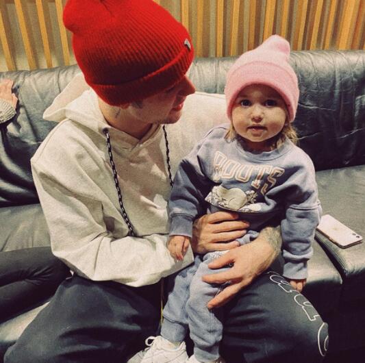 比伯晒与妹妹合影戴同款帽子 萌娃盯镜头可爱呆萌