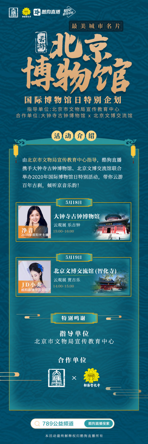 一年一度的5·18国际博物馆日即将到来,许多博物馆借助数字时代的云直播手段,为广大人民群众精心制作一道道文化大餐。在5月18日、19日两天,由北京市文物局宣传教育中心指导,酷狗直播联合大钟寺古钟博物馆、北京文博交流馆推出云游北京博物馆的特别企划。酷狗主播净音、JD小奔,将分别前往大钟寺、智化寺两大历史古迹,在展馆专家的带领下,以云观展的方式与网友一同感受中华文明的博大精深。