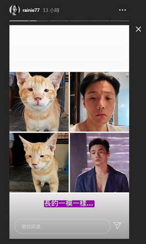 杨丞琳17日透过社交平台的限时动态上传一张4格照片,可见左边是单眼皮小眼睛的猫咪,右边就是李荣浩,这张图流传在各大社群平台许久,传到她那时更亲自认证:“长得一模一样。”