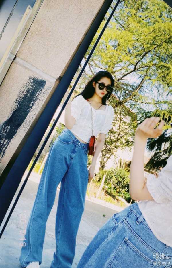 关晓彤身穿白色短款泡泡袖上衣,下身搭配高腰阔腿牛仔裤,她戴着墨镜,站在一面镜子前凹造型,大秀长腿,魅力十足。