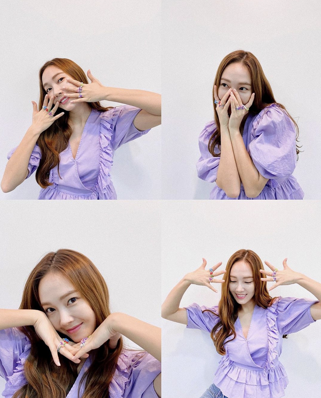 5月20日,郑秀妍在社交平台晒出一张四宫格照片,她穿着紫色泡泡袖v领上衣,露出迷人的笑容,并且摆出各种俏皮的手势,手上戴着五彩的花花戒指,十分抢眼。