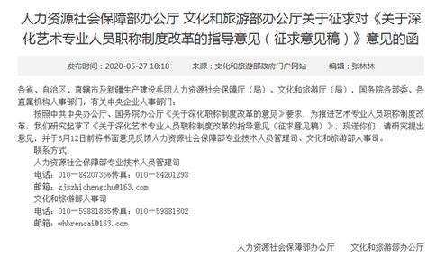 人力资源社会保障部办公厅、文化和旅游部办公厅联合发文征求对《关于深化艺术专业人员职称制度改革的指导意见》的意见中国新闻网5月29日报道 近日,人力资源社会保障部办公厅、文化和旅游部办公厅联合发文征求对