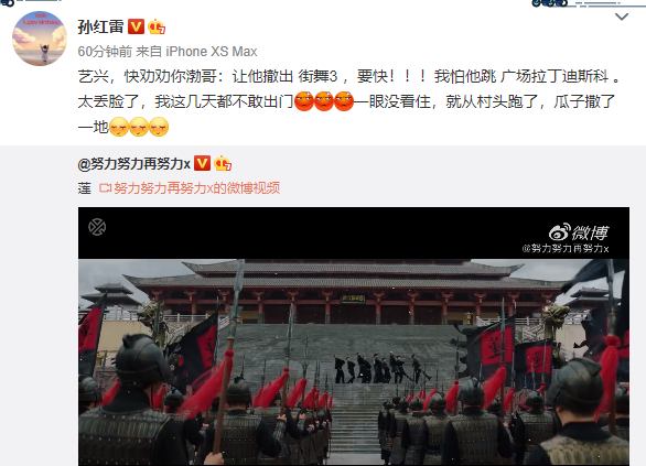 6月1日晚,孙红雷转发张艺兴的最新MV,并喊话:“艺兴,快劝劝你渤哥:让他撤出街舞3 ,要快!!!我怕他跳广场拉丁迪斯科。太丢脸了,我这几天都不敢出门,一眼没看住,就从村头跑了,瓜子撒了一