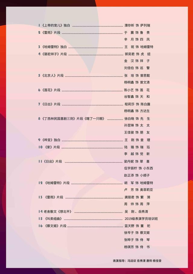 整台演出阵容豪华,人艺数代演员同台演绎《上帝的宠儿》《雷雨》《哈姆雷特》《骆驼祥子》《北京人》《莲花》《日出》《哗变》《家》《蔡文姬》等十余个经典剧目片段。蓝天野、濮存昕、冯远征、梁丹妮、吴刚、岳秀清、王刚、胡军、王斑、龚丽君、陈小艺、卢芳、张培、于震、徐白晓、程莉莎、谷智鑫、郭奕君、徐岑子、孙翌琳、辛月、金汉、周帅、王佳骏、杨明鑫、伍宇辰柠、赵正添、李越、陆璐、刘倍伯等老中青三代演员以及尚未毕业的人艺表演学员培训班的年轻人们都将在舞台上亮相。