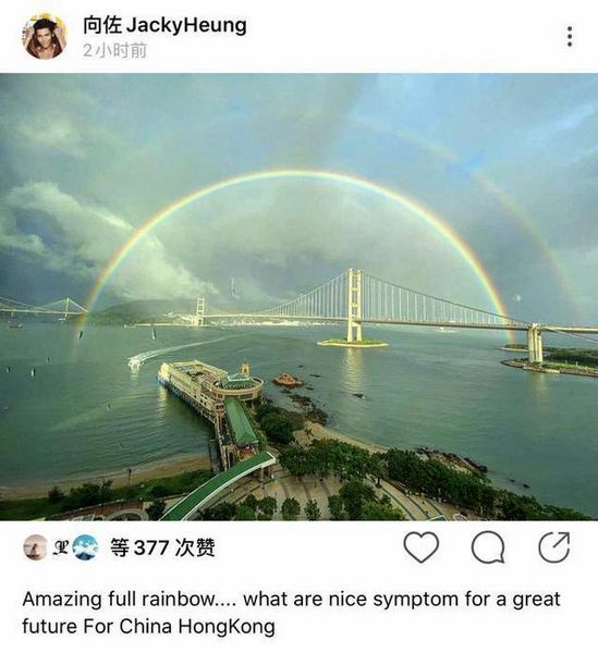 6月17日,台媒曝光了郭碧婷挺着大肚外出的照片,郭碧婷疑似怀孕引起热议,但当事人向佐未有回应,反而在社交平台更新动态晒出了香港双彩虹的美景图。