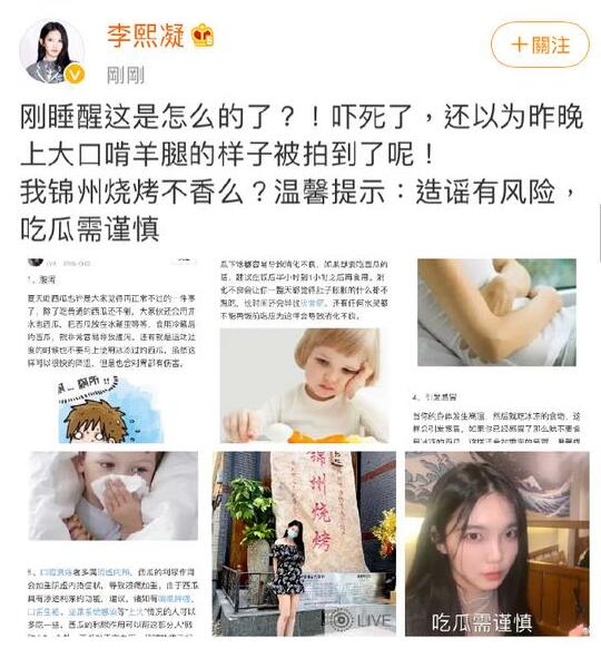 近日,有媒体拍到嘉羿与李熙凝从停车场同回小区的画面,引发网友对两人恋情的猜测。22日中午,李熙凝晒出多张吃瓜不良反应与“吃瓜需谨慎”的表情包辟谣此事,发文:“刚睡醒