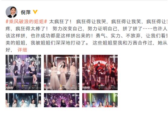 文末,倪萍还不住感慨:“姐姐们真的太好了,每一位都好!前台的好,幕后的也好。出高招儿编导们、排舞配曲的老师们,都太疯狂了!老同志我赞了!”