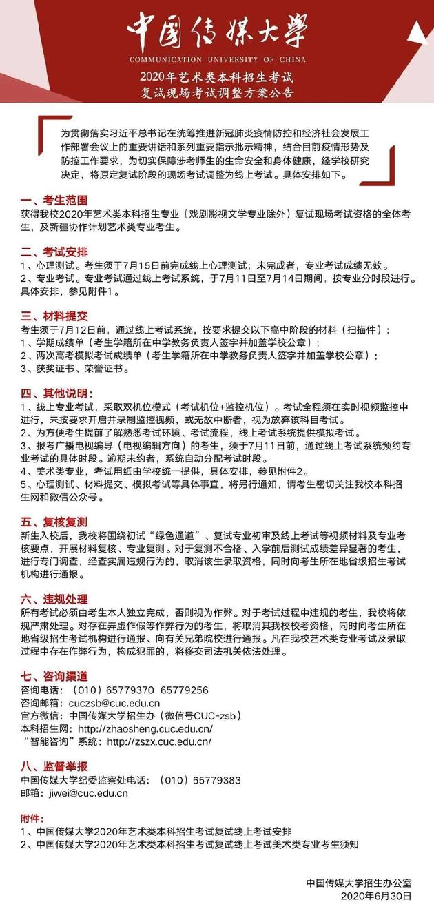 中国传媒大学6月30日发布《2020年艺术类本科招生考试复试现场考试调整方案公告》。公告称,原定复试阶段的现场考试调整为线上考试。考生须于7月15日前完成线上心理测试,专业考试于7月11日至7月14日