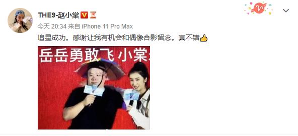 7月1日晚,THE NINE成员赵小棠晒出和岳云鹏的合照,兴奋称:“追星成功。感谢让我有机会和偶像合影留念。真不错”。她还在两人的合影上写道:“岳岳勇敢飞,小棠永相随。”