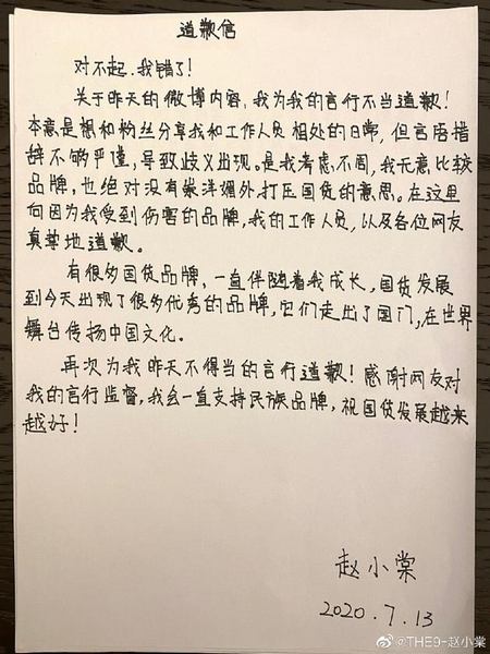 7月13日凌晨,THE NINE成员赵小棠在微博晒出手写信道歉:“对于我微博不理智的发言,我接受大家批评与建议,向因此造成伤害的品牌方,我的队友和工作人员,以及关注这件事的网友表达诚挚歉意。感谢大家对我善意的批评,我全部记在心里了,我会认真反思自己,少说多做,谨言慎行,欢迎大家继续监督”,并表示自己本意是想分享和工作人员的相处日常,无意比较品牌,也绝对没有崇洋媚外打压国货的意思。