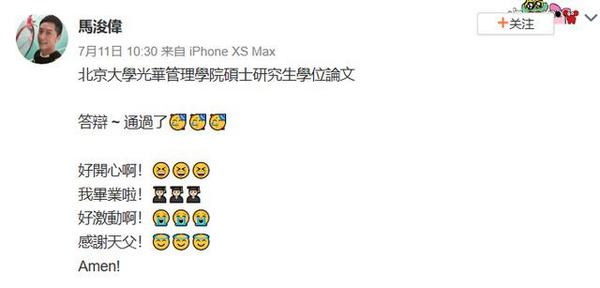 7月11日上午,TVB知名男星马浚伟在社交平台开心发文宣布自己已经通过了北京大学光华管理学院硕士研究生学位的论文答辩,拿到了硕士学位,自己非常激动开心。他还还出一张穿着正装的自拍照,一身西服笔挺,对镜头比V灿笑心情超好。