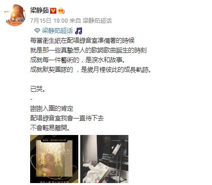7月15日,梁静茹入围第31届后发文,感谢肯定,并表示不会轻易离开配唱录音室,“每当卫生纸在配唱录音室准备著的时候,就是那一些真挚感人的歌词歌曲诞生的时刻,成就每一件艺术的,是泪水和故事。成就默契团队的 ,是岁月裡彼此的成长轨迹。已哭。谢谢入围的肯定,配唱录音室我会一直待下去,不会轻易离开。”