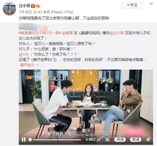 7月16日,网上曝光一段秦昊在某节目中模仿汪小菲区别对待儿子和女儿的视频。汪小菲看后,大玩秦昊在《隐秘的角落》中的爬山梗,发文喊话:“你等我隔离完了回北京带你爬香山啊,不坐缆车的那种”。