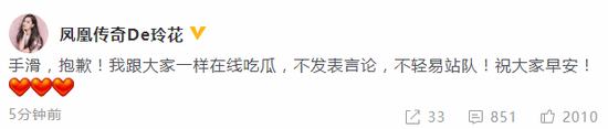 玲花回应点赞diss老公徐明朝微博事件,她发文称:“手滑,抱歉!我跟大家一样在线吃瓜,不发表言论,不轻易站队!祝大家早安!”