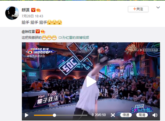 日前,孙红雷分享张艺兴在《这就是街舞》的跳舞视频,写道“这把我傲骄的”,舒淇随后转发,表示“给手,给手,给手”,还配上了可爱的小表情。随后,张艺兴回复舒
