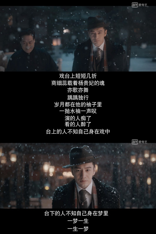 “长生殿落泪”的桥段中,黄晓明极具感染力的表演在现实与回忆的交错间代入了一段悲伤往事。“岁月都在他的袖子里,一抛水袖一声叹。演的人痴了,看的人醉了。台上的人不知自己身在戏中,台下的人不知自己生在梦里。一梦一生,一生一梦。”黄晓明磁性的嗓音和扎实的台词功底为剧情增色不少,那滴克制且令人动容的泪水,“滴”进了每个观众的心里。