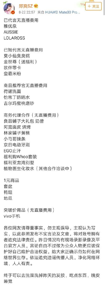 郑爽否认网传直播坑位费:所有商品都没收取费用
