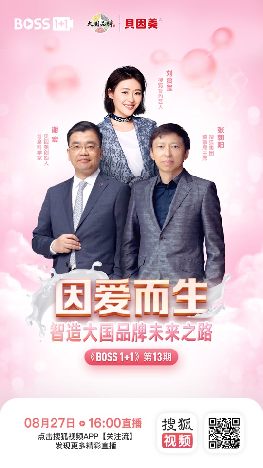 搜狐视频今日上线《BOSS1+1》新一期,用视频直播采访企业界领袖,通过行业领袖对谈深度探讨社会经济产业新动向。本期主题为“因爱而生——智造大国品牌未来之路”,由搜狐公司董事局主席兼CEO张朝阳“同框”贝因美创始人、首席科学家谢宏,搜狐签约艺人刘贾玺同时连线主持。