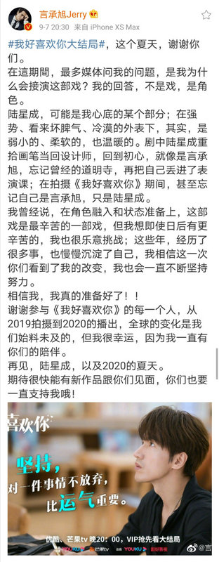 《我好喜欢你》甜蜜收官 言承旭长文告白重拾初心