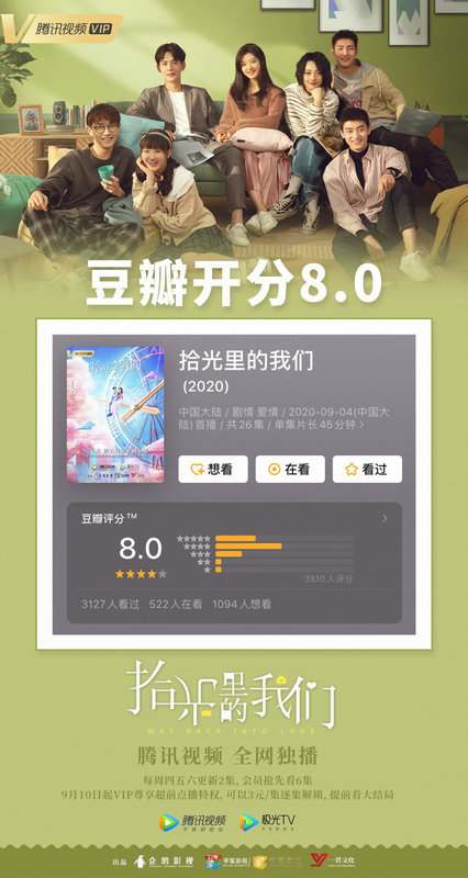 电视剧《拾光里的我们》正在腾讯视频独家热播中,本周起每周四五六20点更新2集,会员抢先看6集,9月10日起VIP尊享超前点播特权,提前看大结局。