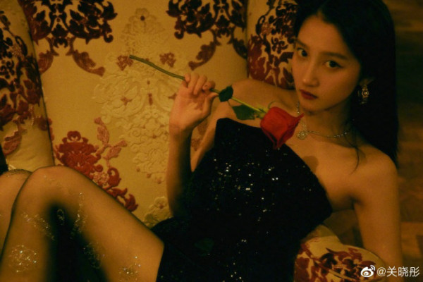 9月20日,关晓彤晒出一组玫瑰复古大片。照片中她身穿抹胸亮片黑色小短裙,搭配黑丝袜,手拿红玫瑰,在沙发上摆出撩发、摸腿等性感姿势,大秀长腿和高鼻梁侧颜,风情万种。