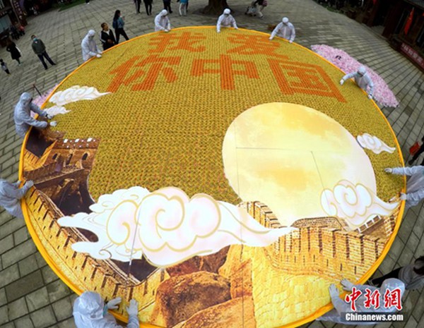 9月30日,河南洛阳老君山广场,工作人员用上万枚简装彩色月饼拼出“我爱你中国”,用这种特别的方式迎接国庆和中秋佳节。据介绍,节日期间,这些月饼将会全部免费赠送给前来游玩的游客。