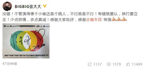 被批演技像“小偷” 张大大回应:有错就认 不行就是不行