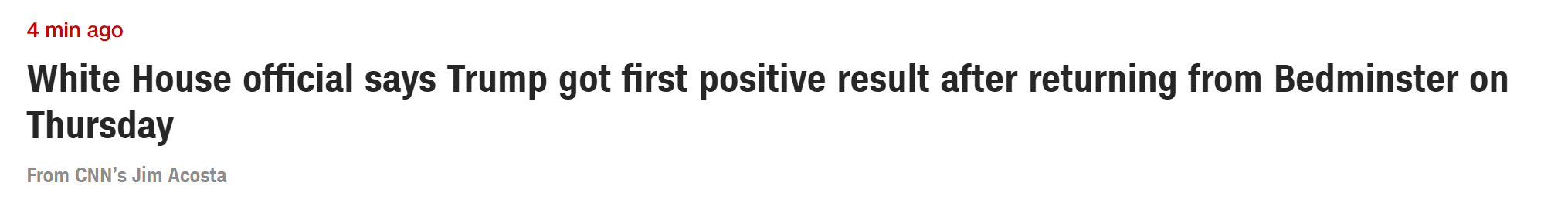 CNN称,特朗普在离开筹款活动大约8小时后,宣布了自己和梅拉尼娅检测呈阳性的这一消息,当时他已经回到了白宫。