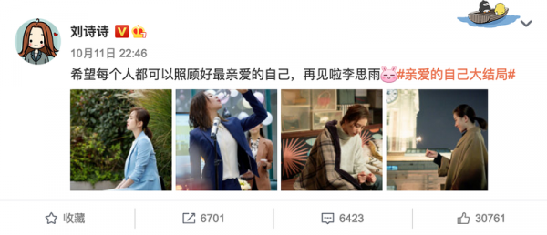 11日,在电视剧《亲爱的自己》大结局当晚,李思雨的扮演者刘诗诗发一组剧照告别角色,并写道:“希望每个人都可以照顾好最亲爱的自己。”