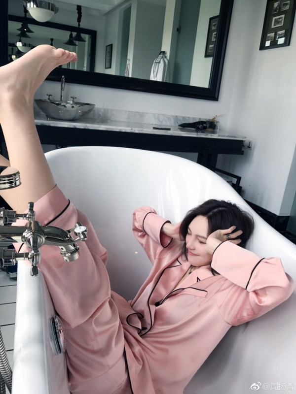 22日凌晨,罗志祥女友周扬青微博晒出美照。照片中,周扬青身穿睡衣,坐卧浴缸内,表情天真可爱。